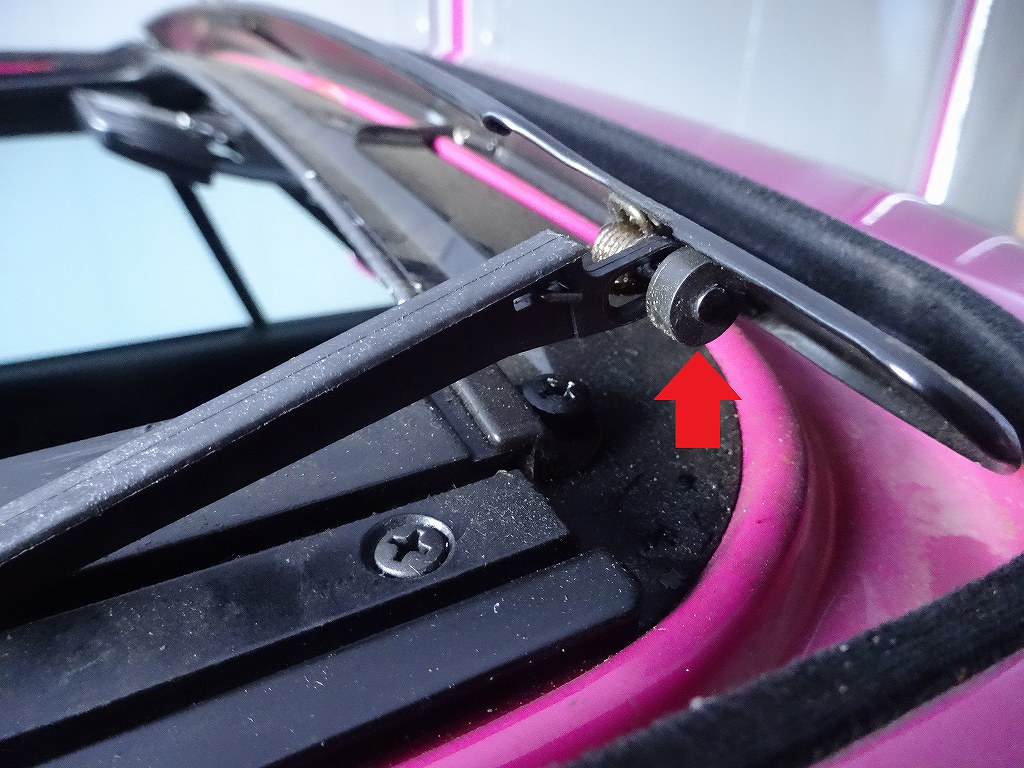 ちなみにサンルーフにも当時のポルシェの思考を感じられる部分があります。上記画像の矢印の部分の丸いパーツなのですが、これは先程説明したプラスチックバーが外れないように抑えておくパーツです。材質は硬化ゴムか何かだと思うのですが、これの留め方が非常にポルシェっぽいのです。実はこのゴムは真ん中から出ているバーに入れてあるだけで、何の固定もされていないのです。もちろんそれなりに弾力があるのでそんな簡単に外れる事は無いと思いますが、他社だったらネジ山を作って締めるくらいの事はしそうな部分です。「走る部分以外はそれなりでいいんじゃね?つーかサンルーフって走るためにいるかぁ?」等と当時の開発会議では話していたのでしょうか?交換しながらメカニックに「相変わらず走る事以外は考えてないね・・・」と言うと「走りに関係するとこ以外を触っている時は本当にスゴいメーカーなのか疑わしくなります。」と言うコメントを頂きました。ある意味「さすがポルシェ!」と言いたくなる発見でした。