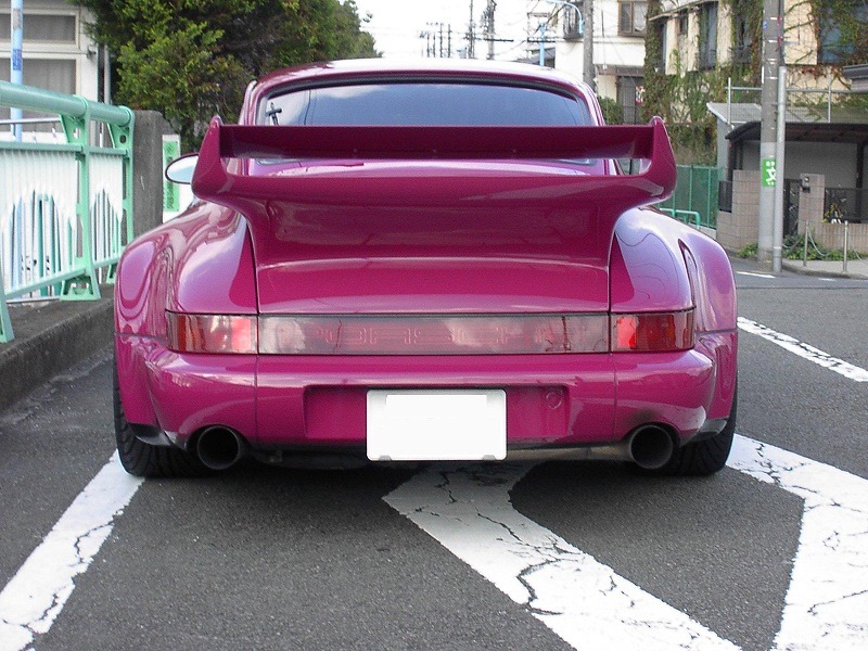 高速道路でポルシェ・911ターボ(997)に遭遇しました。そこまで道が空いてなかったのでお互い80km位ででのんびり走ってたのでちょっとリアルな運動性能とかって見れなかったですけれども、何かすごくどっしりとした感じの印象を受けました。どっしりと言っても別に動きとかが重いって言う意味ではないです。今回はそこまで動きがわかる程一緒に走ってないですのでわかりません。しかしこうして後ろから見ただけでもかなりのポイントが進化されているのがわかります。まず私が一番最初に目についたのがマフラーの出口の位置でした。ぴんぽるの真後ろからの画像と比べてみればわかりやすいと思いますがまず高さが全然違います。ぴんぽるはボディの一番下なのに997はボディの真ん中近くに出口ありますね。これは排気系の取り回しの自由度が上がったって事でしょうか?それともマフラー自体がコンパクトになったんでしょうか?次に目についたのはリアのダクトです。たまにチューンしたポルシェでリアにダクト入れてる人がいますが、あれはパワーアップしたエンジンが発生する熱がすごいのでエンジンルームの冷却率アップのために入れてるそうです。と言う事は純正の状態でダクトが空いているって事はチューンドエンジンと同じくらいの熱が発生するって事ですかね?まぁ997は480馬力あるそうなのでヘタなチューンドエンジンより馬力あります。ぴんぽるが1992年に全長4250mm、全幅1780mm、全高1310mm、車重1450kg、3.3リットル、ターボチャージャー付空冷水平対向6気筒エンジン、320ps/5750rpm、45.9kgm/4500rpmと言うスペックで世の中に出て来ましたが、14年後の2006年に997ターボは全長4450mm、全幅1852mm、全高1300mm、車重1585kg、3.6リットル、ターボチャージャー付き水冷水平対向6気筒エンジン、480ps/6000rpm、69.4kgm/2100~4000rpmと言うスペックで登場しました。衝突安全基準とか年々厳しくなってるのを考えると大きくなって行くのはある意味仕方がないですけれども、基本的に同じエンジン(空冷から水冷と言うのは考えから抜かしてです。)をここまで突き詰めて行くのはすごいと思います。