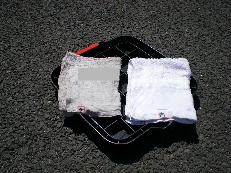 これは完全に普通のタオルです!お歳暮、または何かの記念でカレンダーと一緒にもらったような気がします。こちら赤枠で囲ってますが、タと内と書いてあります。これは単にタイヤ用と内装用って別けてあるだけです。色見ればわかりますがやっぱりタイヤ(正確にはホイール。)を拭く用に使ってると汚れが激しいです。こんなに汚れたタオルで内装拭いたらきれいになるどころか逆に汚れてしまうので分けてます。