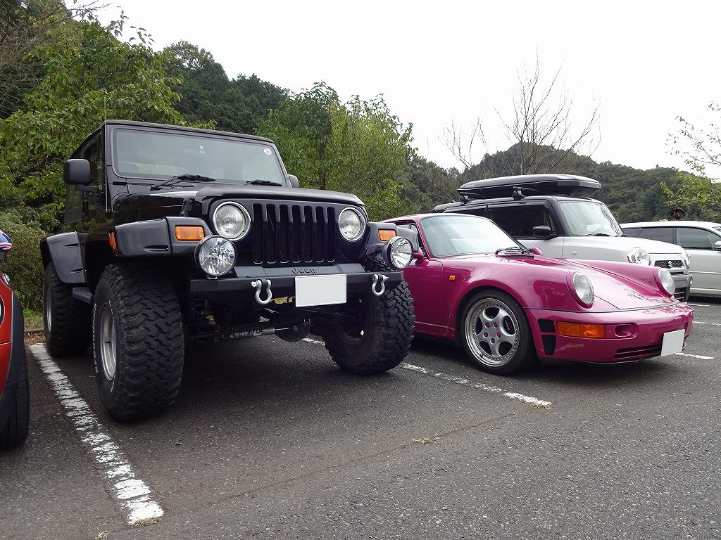 先日、いつものドライブコースを走行してから休憩していると、見慣れないジープ・ラングラーがやって来ました。「リフトアップしたラングラーってスゴイ迫力だな・・・」とか思いながら見てたら、ラングラーのドライバーさんがぴんぽるの方に歩いて来ました。私はちょっと離れたところで違う方と話をしていたので、その方の顔が見えなかったのですがかなり熱心にぴんぽるを見ています。「きっとポルシェが大好きな方なんだろうな!」と思いながら近づいてみると、車仲間のKさんでした!Kさんは同じポルシェ・911ターボ(964)のオーナーさんで、ラングラーとジャガー・XJRもお持ちと言う事は聞いていたのですが、実車は911ターボしか見た事がなかったので全然気が付きませんでした!Kさん、ご挨拶が遅くなって本当に申し訳ありませんでした。もちろんその後は車談義に花を咲かせて、楽しい時間を過ごさせて頂きました。次回はぜひKさんの愛車の911ターボと一緒に写真を撮らせて頂ければと思います。しかし、休日のワインディングの駐車場は車好きばかりで非常に楽しいです!この日もスバル・R1とスバル・R2のオーナーさん達や、ご主人も奥さんも夫婦揃ってトヨタ・MR2(AW11)に乗ってらっしゃる方等、普通ではお会い出来ない車好きの方々と色々お話させて頂きとても楽しい時間を過ごせました。ちなみに私がいつも休憩する駐車場は「鳥居原ふれあいの館」と言うミーティング等で人気の駐車場です。最近は土日も時間が出来ましたので車好きな方との交流を広めるためにも、なるべく行ってみようと思います。