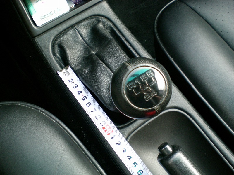 スポーツカーはシフトストロークが短い方がいいと言われてますが、個人的にはぴんぽるは結構長いように感じます。どのくらいの距離なのかちょっと測ってみました。これが1速に入れた状態です。