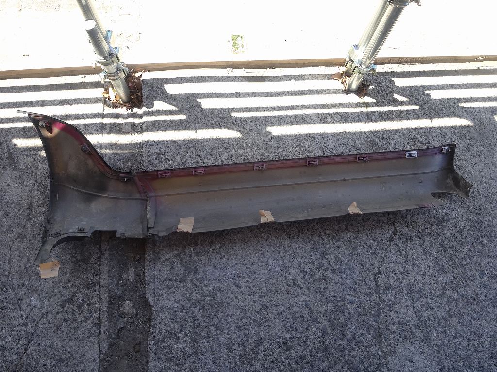 遅くなりましたが、ぴんぽるのサイドステップのゴムモールの交換、新しいストーンガードの貼り付けをご紹介します。ネットで調べると「サイドステップはクリップで留まっているだけだから、力任せに引っ張れば良い。」等と言う、実行したら恐ろしい事になりそうな間違った情報が出て来るのでご注意下さい。ちなみにサイドステップに使用されているクリップには「引っ張るだけのタイプのクリップ。」と「裏からナットで留まっているネジタイプのクリップ。」の2種類があります。引っ張るだけのタイプのクリップも裏からナットで留まっているネジタイプのクリップも、外した時にかなりの高確率で破損します。クリップを注文してから届くまではサイドステップ無しで走るか、届くまで乗らないかを決めてから行った方が無難だと思います。ちなみにどちらのタイプのクリップも、1個約800円と中途半端に高いです。片側10個、両側だと20個ですので自動的に「折れた数だけ買うか。」と言う思考になってしまいます。また、サイドスカートは2分割式になっており、ドア下部とリアフェンダー下部で分かれています。なお、説明では解りにくいクリップをメインで説明していますが、サイドスカートはドア下部、リアフェンダー下部共に車体下でクリップ以外のネジやナットで固定されています。これらは下側から見ればすぐに解るので、説明では省略しておりますのでご了承下さい。それではまず、上記画像のようにリアをジャッキアップし、リアタイヤを外した状態にします。