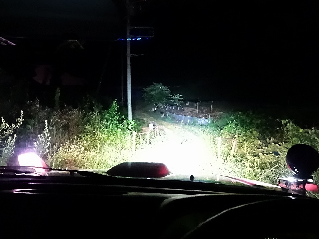こちらがボンネットの追加ライトを追加で点灯した状態です。色合いがイエローからホワイトになったのが解ると思います。ボンネットから照らしているせいか、さらに遠くまで見えるようになっています。