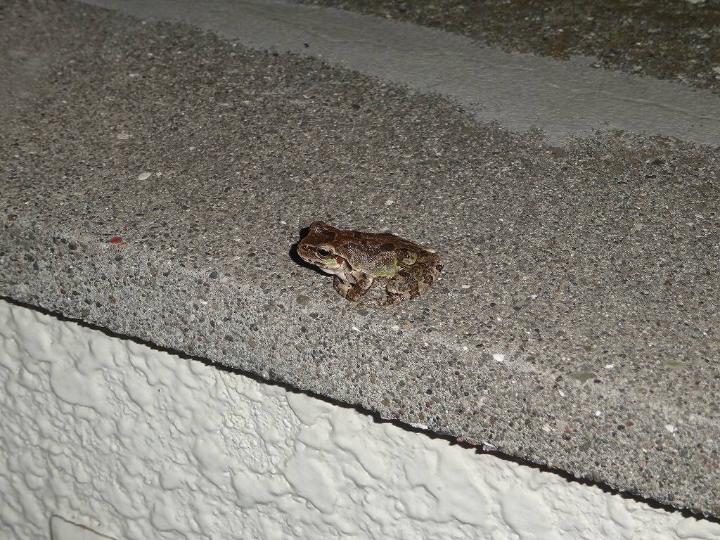 先日、ブログでご紹介したカエルなのですが、なぜかまだお店にいます。別に飼っているワケではないのですが、水道近辺で作業していると上記画像のようにこっち見てたりするので目が合います。ほぼ毎日見るのでこの近辺にいつもいるのでしょうか?しかも日に日に大きくなっている気がします。考えてみたら、夜になれば店の明かりに虫が集まるので、食事は食べ放題です。しかも私が見かけると毎回水かけてあげたりしているので、結構快適な環境なのかもしれません。快適な環境を見つけたら、そのまま住み着くとはカエルもなかなか頭が良いです。ちなみにカエルは、可変式マフラーの如く体の色を変化させて敵から発見されにくくする能力があるようです。言われてみると、幼少時にそんな話を聞いた事があるような気もします。せっかく本人が目の前にいるので、ご協力頂きました。