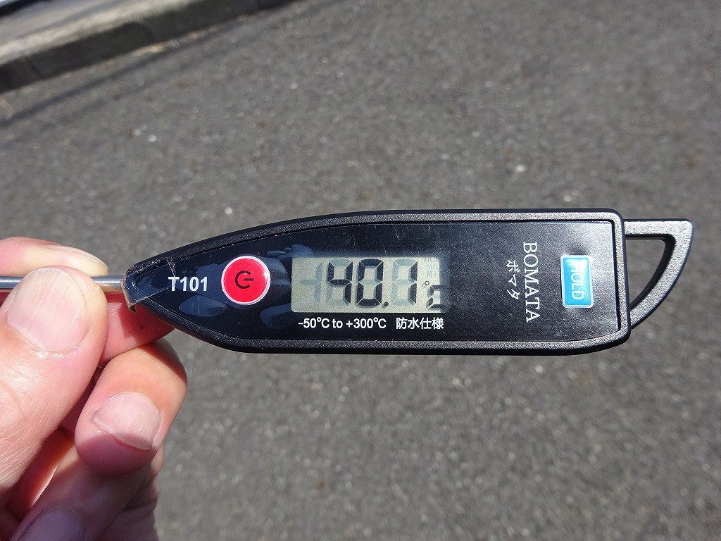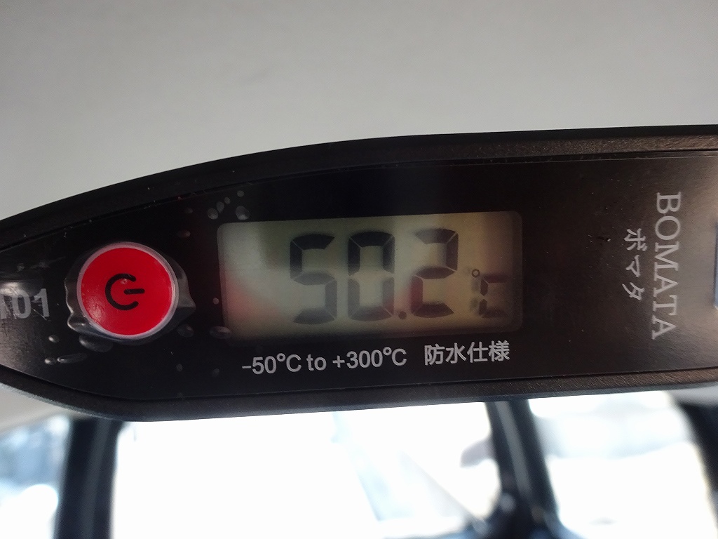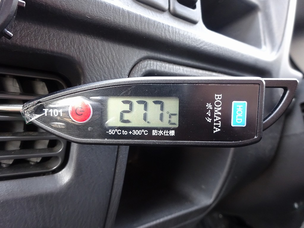 こちらがカーテンで仕切った状態の後部エリアの温度です。同じような高さで計測したのですが、50.2度と15度も差が生まれました。ここまでやれば充分過ぎるくらいに快適ですので、サンバーの対処はこれで完了となりました。今回は解りやすいように猛暑の炎天下で静止状態で実験しましたが、走っている時のエアコン吹出し口温度は大体20度前後でした。渋滞にハマった時だけ多少温度が上がりますが、上記のようにアイドリングの回転数を上げてあげるだけで非常に快適に乗れました。繰り返しますが、アイドリングの回転数を上げるのもカーテンを装着するのもすべて自己責任で行って下さい。同じ事をして何かトラブルが発生したとしても、当方は責任を取りませんのでご注意下さい。