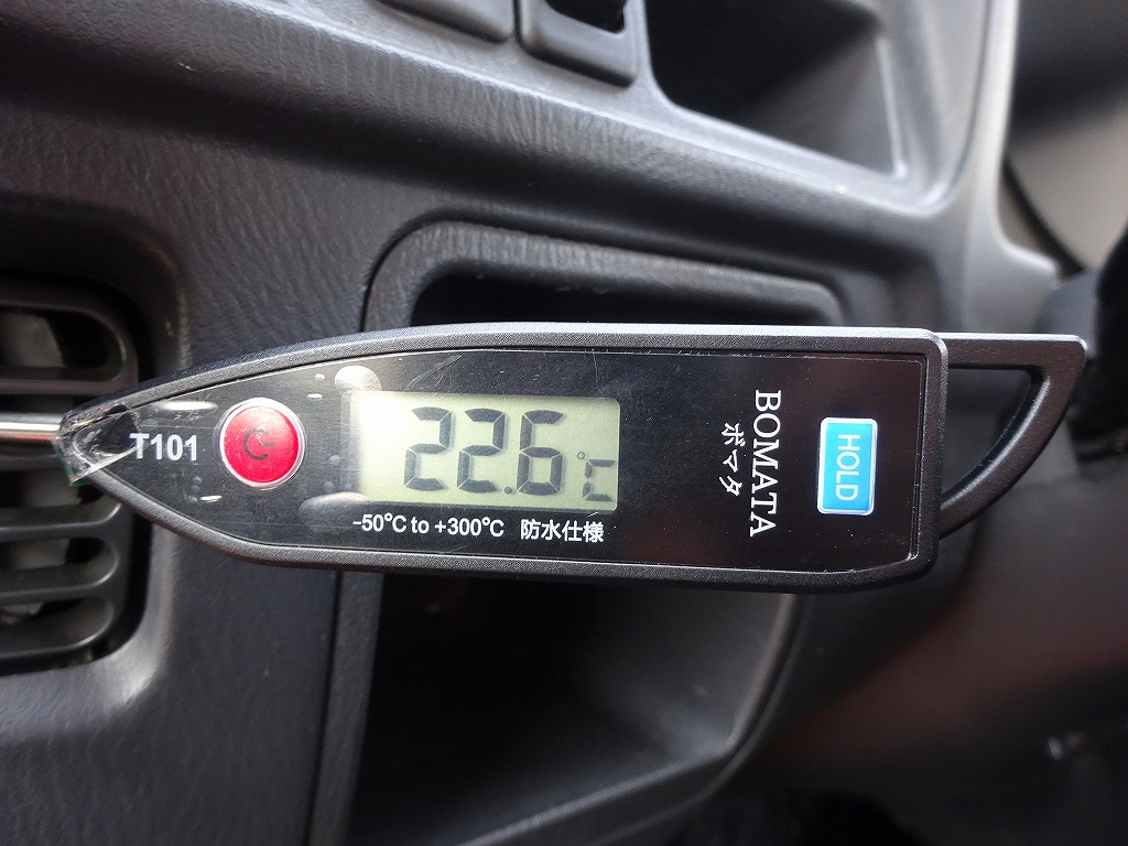 その技とは「エンジンの回転数を上げて、エアコンコンプレッサーの1番効率の良い回転数でアイドリングをする。」です。緒方社長が「古い車はこの技を使うだけで結構温度が下がるよ!」とおっしゃっていましたが、2000回転まで上げると22.6度と、5.1度も下がりました!