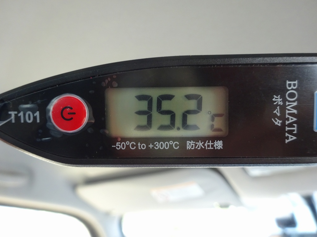 カーテンで仕切った状態での運転席上部の温度です。1番外気に近いルーフ近辺で計測したのですが、35.2度でした。