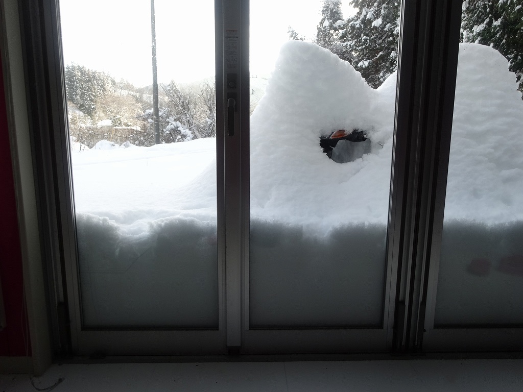 ここは本当に関東か?と思わせる深さの雪です。ちらっと見えるのはスクーターです。この状況ではガレージは開きません。昨日の夜に帰って来て玄関回りを雪かきしたので表に出れますが、昨日丸一日家にいて雪かき忘れた状態で今朝を迎えていたら、雪が溶けるまで家から出れなかったと思われます。