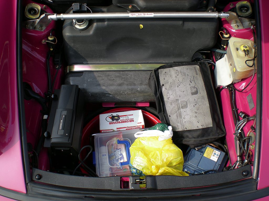 先日なぜかわかりませんけれども、いきなり「徹底的に洗車しよう!!」と思ったので徹底的に洗ってやりました!!内装からフロントのトランクまで全部荷物降ろして掃除したのですけれども、トランクに結構色々モノがある事に気が付きました。これだけあると何かしらいらないモノが無駄に積まれてる気がしてたまらないので、チェックしてみていらないモノは全部降ろすために「いるモノ」と「いらないモノ」の区別をつけたいと思います!!まず、写真中央くらいにある白地に赤の文字が書いてある箱ですが、これはエアーコンプレッサーです。コンプレッサーはスペアタイヤの空気入れるのに絶対に必要ですので「いるモノ」です!次にコンプレッサーの右隣のメッシュのバックですが、これは車載工具を入れてあります。当然車載工具は「いるモノ」ですので次に行きます。次はバッテリーの左隣の黄色と白のビニール袋ですが、これは白に予備オイル、黄色にオイル入れる時に使うじょうごが入ってるのでこれまた「いるモノ」です・・・最後にビニールの左隣のクリアケースです!!開けて中をチェックしてみると、期限の切れた本革用のクリーナーシートが入ってます!!やっと「いらないモノ」発見!!と思いきや、その下から予備の塗料タッチペンやら軽度なパンク直すための道具やら色々出てきました・・・と言う事は「いらないモノ」は無いと言う事ですね??頑張ってトランク整理しようと思ってただけにちょっと残念な気分です。まぁ余計なモノを積んでなかったと言う事ですしよかったんですけどね・・・今後は今あるモノをもっと上手に整理すると言う方向で考えて行こうと思います!!