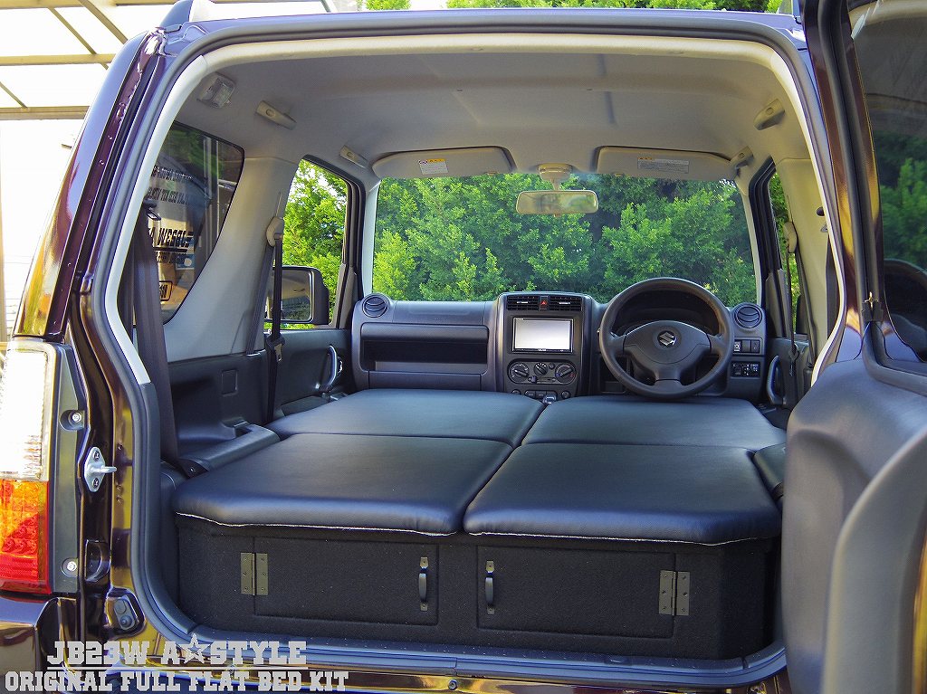 私は仕事等で夜中も朝も関係なく動かなければいけないので、車の中で仮眠を取る事が結構多いです。今までは助手席を最大限まで倒して仮眠していましたが、「スズキ・ジムニーをセカンドカーとして愛用しているのであれば、フルフラットにして車中泊を楽しむべきだ。」と素晴らしく余計なアドバイスを下さった方がいたので、本当に考えないといけない事になりました。上記画像のように、純正並に本格的なキットが多数販売されているのですから、今から商品化して参入なんて絶対にムダだと思います。まぁ実験サンプルとして、私の愛車用に作る費用は出してもらえるので良しとしますか・・・私のジムニーはJB23型の前期ですので、フルフラットにして上質な仮眠を取るためにはいくつかの問題があります。まずリアシートが跳ね上がった状態で固定されてしまって邪魔なので、ワンタッチで外せるようにしないといけません。次にリアラゲッジスペースと、倒したリアシートとの段差を埋めなければいけません。まぁここは何か簡単な台のようなモノを置けば解決しますのでそこまで問題ではないのですが、やはり難問はワンタッチでシートを外せるようにする改造ですね・・・ボルトで留まっているだけなのですが、簡単に外せて簡単に戻せるようにするにはそれなりに大変そうです。これさえクリアしてしまえば、後は助手席のヘッドマットを外してシートを倒し、ベッド状のクッションを敷けば完成です。「そんなクオリティで売れるか!」と言われそうですが、今更そんなモン出したって意味ないので企画段階で終わって頂こうと思います。むしろこのブログを見て諦めてくれると嬉しいのですが、あの人達あんまり私のブログ見ないんですよね。最近車もバイクも販売が忙しいので、これ以上忙しくしないで頂きたいのです・・・