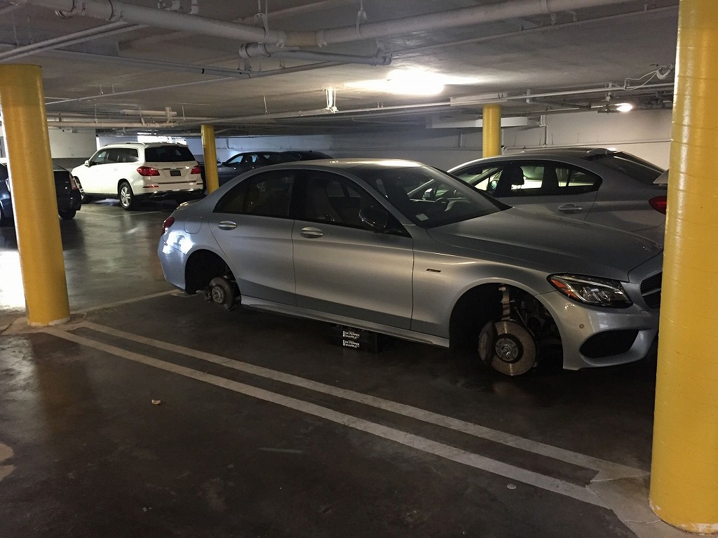 東京都で高級車のホイールの窃盗をしていた犯人が捕まったそうです。車自体の盗難も注意ですが、ホイールの盗難は地味に注意が必要です。ホイールを盗む時は、ホイールを外すためにジャッキアップをします。ジャッキで車体を上げてからホイールを外すのですが、次のホイールを外すためにはジャッキを外す必要があります。普通だったらここでジャッキスタンドを使って車体を上げたままにするのですが、盗む側としてはジャッキを外せれば良いのでスタンドなんて遣いません。上記画像のように適当な場所(ブレーキローターも多いです。)にブロック等をかませてオシマイです。これをやられる事によって、場合によってはブロックをかませた場所がへこんだりするのです。ホイールの盗難と聞くと、被害はホイール代だけと思われがちですがボディの修理代もかかるのです。車好きとしてはホイールもムカつきますが、適当な場所にブロックかまされるのはもっとムカつきます。こんな気持ちになるのがイヤなので、私はぴんぽるを手に入れた時に最高レベルのセキュリティを導入したのです。当時で50万円近くしましたが、ショックセンサーからホイール盗難防止の傾斜センサーまで装備しているので今まで盗難等は1回もありませんでした。現在では当時と同等レベルのセキュリティが40万円くらいになっているので、盗難が心配な方にはオススメです。セキュリティの話をしていると「セキュリティに40万円!?」と驚く方がいますが、40万円の投資で愛車自体と数十万円のホイールを守れるのであれば安いと思うのは私だけでしょうか?