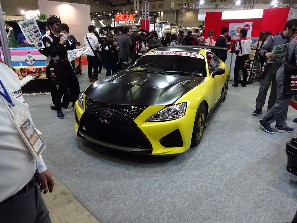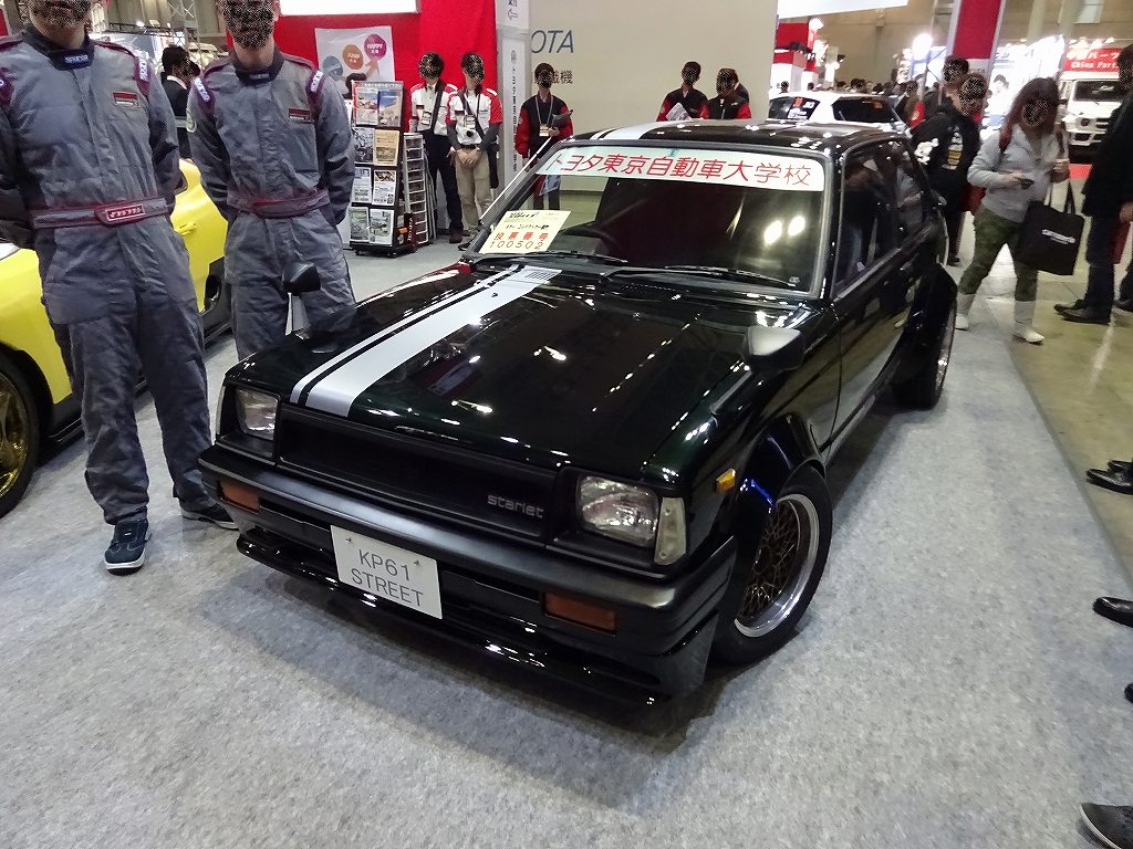本日は、以前に当店でトヨタ・スターレットを販売させて頂いた、トヨタ東京自動車大学校様のオートサロンのブースにお邪魔させて頂きました。以前に学校に見学させてもらいに行った時に、合計4台の出品車両の作成工程を見せてもらったのですが、どの車も独創的なカスタムが施されて素晴らしい作品になっていました!製作過程を見せてもらっていたので、「あのパーツがこう使われているのか!」等と気が付く度に楽しい気持ちになりました。もっとゆっくりご挨拶をさせて頂きたかったのですが、常に人が途切れる事がなくてとてもみなさんお忙しそうだったので、日を改めてまた学校でゆっくり拝見させて頂こうと思います。ちなみに上記画像が当店で販売させて頂いたスターレットです。片側約15cmと言う、超極太オーバーフェンダーと深リムのホイールがカッコイイです!ホワイトボディ状態にしてからペイントと鈑金をしているので、新車のような仕上がりでした!しかもリアスポイラーはトヨタ・チェイサーの流用との事!まるでこのスターレットのためにワンオフで造ったかの如く、キレイに収まっていました。