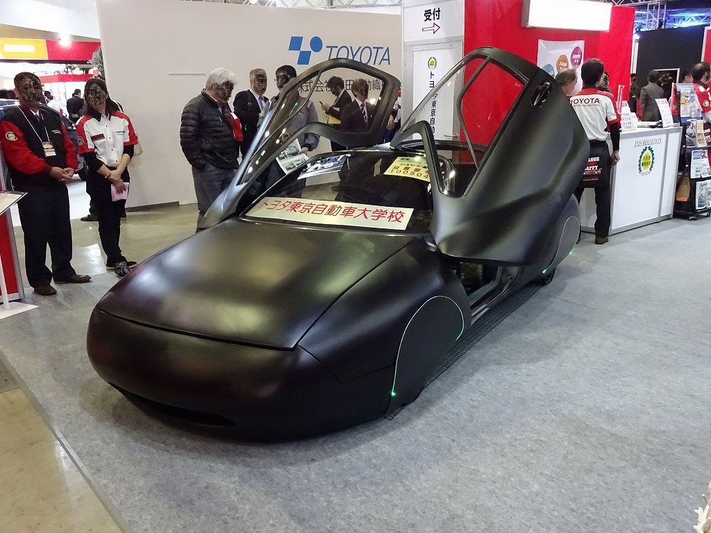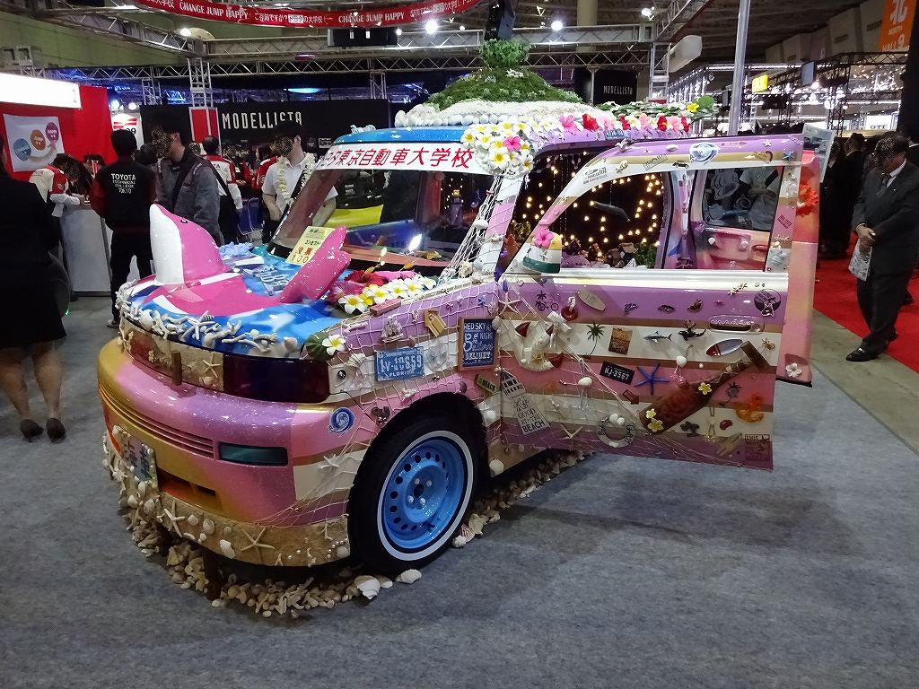 こちらはトヨタ・bBオープンデッキです。こちらの製作過程も拝見させて頂いていますが、車内の凝った作りの小物がすべて手作りです。細かく作られたパーツをすべてレイアウトして固定して行くと言う、気が遠くなりそうな作業です。個人的には色を塗ったスチールホイールとホワイトリボンの組み合わせがここまでカッコイイと言うのは、新しい発見でした。やはりデザインとカラーリング、コンセプト的にも女性が多く見学していたように思えます。今回何人かの生徒さんに話を聞かせてもらいましたが、みなさん非常に活き活きとした笑顔でとても嬉しそうでした。やはり自身の作品がこのような大きなステージで発表される事によって、自分のやって来た事への自信と達成感を感じられるのだと思います。勝手な想像ですが、「長期間の大変な作業を頑張る事によって、このような充実感や達成感を味わう事が出来る。」と言う、トヨタの未来の社員への教育の一環なのではないかと感じました。トヨタ東京自動車大学校様、今回も色々と本当にありがとうございました!本日はみなさんにご挨拶は出来ませんでしたが、後日改めてお伺いさせて頂きますのでよろしくお願いします。