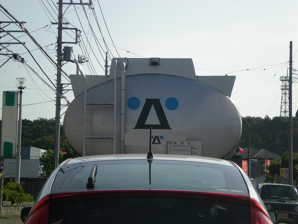 ↑この顔文字に似ていると気が付いた瞬間に爆笑してしまい、危うく車内がコーヒーまみれになるところでした。タンクローリーの輪郭がちょうど顔文字の外側に見えてしまい、もうこの顔文字以外のナニモノでもない位の勢いになってしまいました。しかもちょっと下に小さいのもいるし・・・しかしこの会社は何の会社なのでしょう?タンクローリーっぽいので石油関係なのでしょうか?しかし、会社のロゴがこんなに楽しいと毎日の仕事も笑顔で出来そうですね!私が社員だったら毎日腹筋がスゴい鍛えられそうです。街中は結構面白い看板や広告があったりするのでまた楽しいモノを見つけたらご紹介したいと思います。