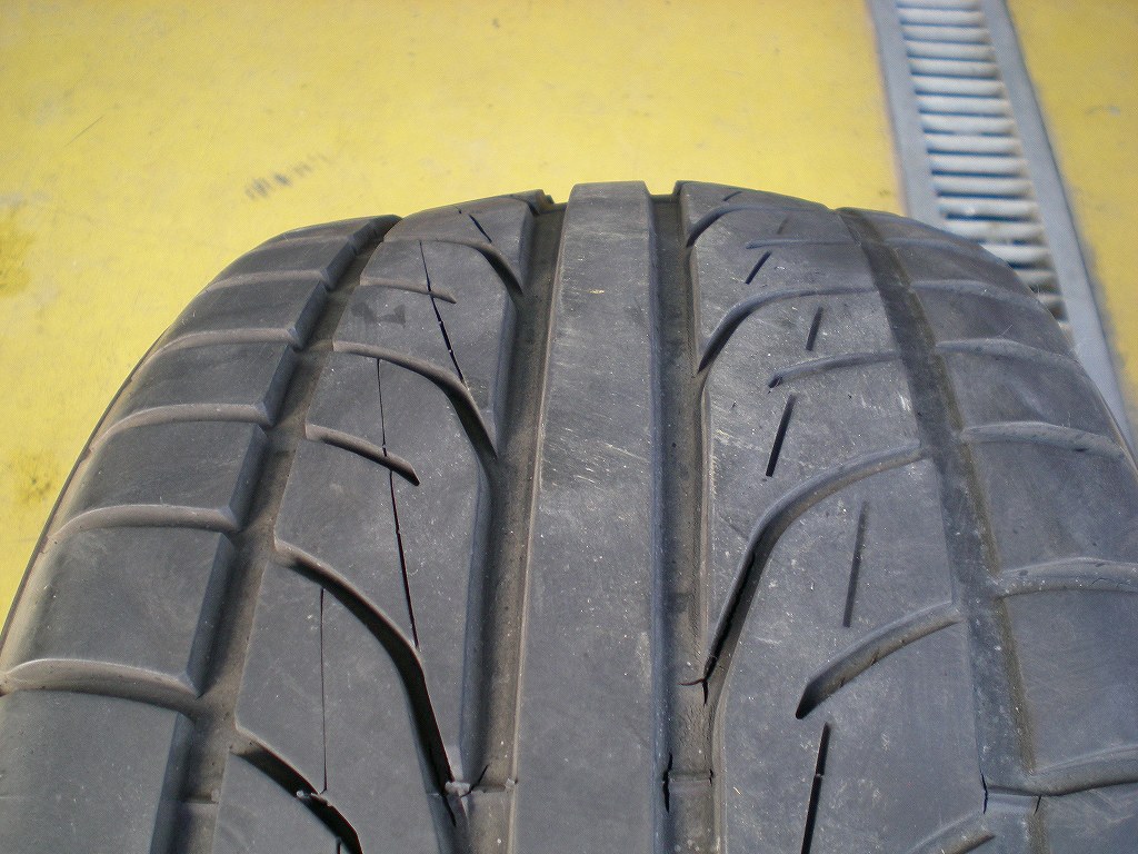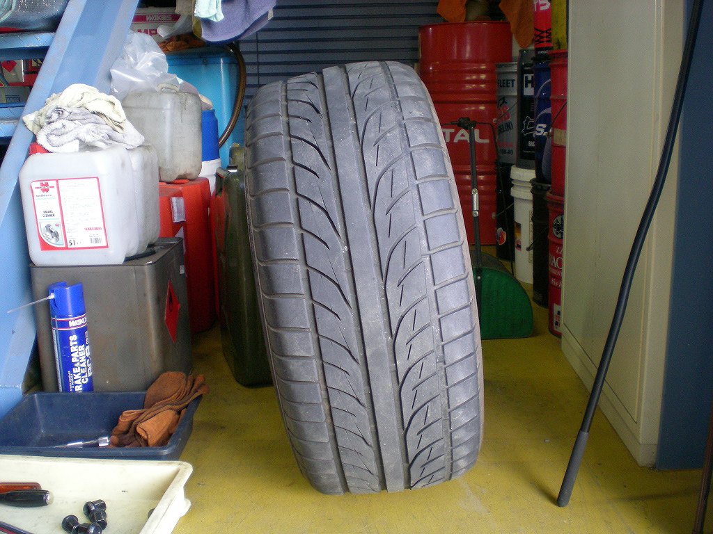 先日、オイルチェンジでショップを訪れた時の事なのですが、オイルチェンジついでに色々簡単なメンテナンス(ウインドウスイッチの交換やサイドブレーキの調整等。)をしてもらっていた時の事です。サイドブレーキの調整をするのにはリアタイヤを外す必要があったので、外したリアタイヤを隣に置いた瞬間にショップの方が「これはマズイですね・・・」と言いました。「何がマズイんだろう?」と思って見てみると、確かに何かが変です。恥ずかしい事に気が付くまでしばらく時間がかかってしまいましたが、水平な床の上に置いてあるのにタイヤが傾いています!これはタイヤのイン側の内部がパンク寸前のような感じになってしまってのでこのような現象になる(申し訳ありませんが、あまりきちんと説明覚えていないので間違っているかもしれません。)そうです。