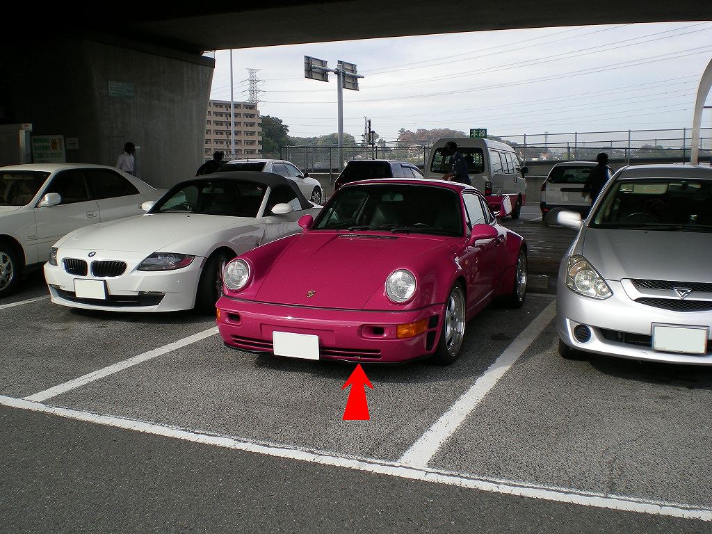 高速のPAでトイレに行って一息つき「さぁ出発!」と思って車に戻ると何か小さく黄色いモノ(赤い矢印の先にすんごい小さいですけど黄色いモノが写ってます。)がバンパーに見えました。何だろうと思って近くで見てみると・・・
