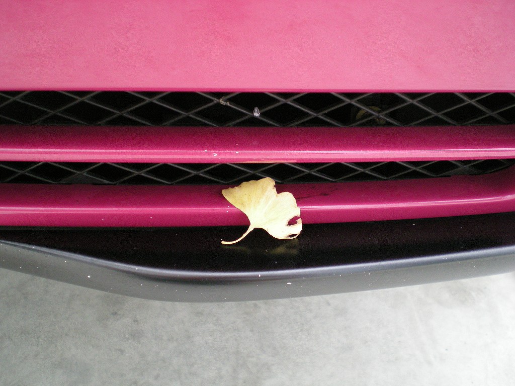 ご覧の通りイチョウの葉っぱでした。見た瞬間に「秋らしくていいなぁ・・・」と言う思いと共に以前に聞いた怖い?話を思い出しました!その方は結構フロントに大きい開口部を持つ車にお乗りだったんですけれども、ある日洗車をしているとフロント開口部の奥に何か変な色の物体を発見したそうです。「何かのパーツかな?」と思って引っ張り出してみると何と小鳥の死骸が出てきたそうです!!!たぶん走行中にフロントから入ってしまったんだろうと言ってましたけれども怖いと言うか可愛そうと言うか何とも言えないお話です・・・不幸中の幸いと言うか、季節が寒い時期だったので死骸は腐敗もしてなかったので丁寧に庭に埋葬してあげたそうなんですがこれが夏とかだったら大変な事になりますよね・・・ぴんぽるはフロントで開いてる部分はそこまで多くないのでいいんですが、愛車が前置きのインタークーラーやオイルクーラーを入れてて大きく開いているタイプのオーナーさんは定期的にフロントを調べてみる事をオススメします。