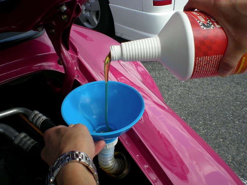 写真のようにトポトポとオイルを入れて行きます。先日掃除したじょうごが大活躍です!先日ブログでじょうごの事紹介したら友達の方々から、「厚紙やペットボトル切ったものなんかも代用品になりますし使い捨てできるのでいいですよ!!」と暖かいアドバイスをいただいていたにもかかわらず、オイルを完全に注ぎ終わってからそのアドバイスを思い出しました・・・次回こそはぜひ試してみようと思います。