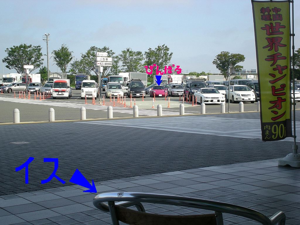 遠過ぎです!!ここまで離れてしまうと全然見えないですね・・・手前の青い矢印のイスが私がお茶飲んでたとこで奥の青い矢印がぴんぽるです。せめてもう1列手前にぴんぽる停められたらのんびり眺めるにふさわしい距離になったでしょうか?今度はもっと席から近いところに車停められるお店に行こうと思います。