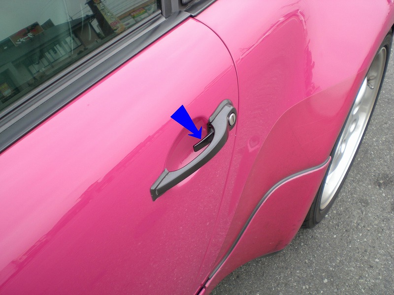 こちらはぴんぽるのドアノブなんですがこの時代の車にしてはちょっと疑問が残ります。開ける時はこの青い矢印の部分を引いて乗るのですがこれは何のためなんでしょうか?機能第一のポルシェの事だから何か意味があるのかと思っていたのですが今だにわかりません・・・ちなみに同じ時代のベンツも同じような形のドアを採用してました。ぴんぽると違うのは青い矢印の部分がなくて、ドアノブ全体を引っ張ると開くと言う仕組みでした。この時代の車はすでに空力をかなり考えられていたので大体の車がドアに埋め込み式だったと思います。そんな他車種が空力を意識してる中でなぜポルシェとベンツだけ(他の車種でも同じような形してる車もあるかもしれませんが私が知らないのでポルシェとベンツだけを取り上げてお話進めます。)こんな見るからに空気抵抗になりそうな形を採用したのでしょうか?とりあえずベンツの理由は事故のためだそうです。どういう意味かと言うともし事故に合って、ドアが歪んでしまって人間の力で開かなくなった時は車のウインチを使ったりロープで縛って他車で引っ張る等して乗員を助け出せるようにとの事でした。確かにベンツのドアノブはすごくゴツい作りしてたような気がします。しかもノブ自体を引けば開くようになってるのでロープ等で引くにはちょうどいい設計になっていると言う事ですね!さてここでわからないのはポルシェです・・・ロープで引っ張るどころか青い矢印が指してるバーを引かないと開かないし第一青い矢印のバーにロープ引っ掛ける時点でかなり難しそうです。これはかなり気になりますね・・・もしどなかた理由をご存知の方いらっしゃいましたらぜひ教えて下さい!