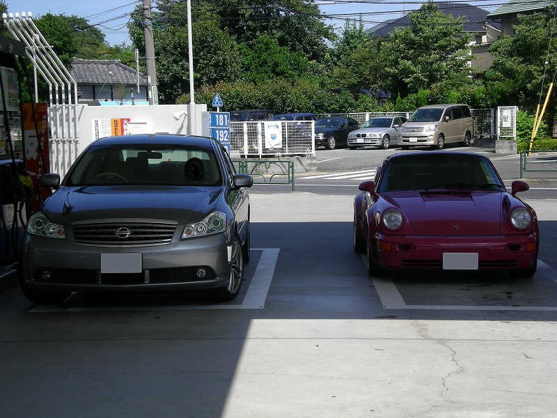 先日いつものスタンドでガソリンを入れた後、会計を済まして車に戻ろうとしたらお隣に日産・フーガが停まってました。「フーガも馬力あるし速いんだろうなぁ?」なんて思いながらぴんぽると見比べていたのですが、こうしてみるとぴんぽるがスゴい小さく見えます!!ちなみにぴんぽるの全幅は1780mm、フーガは1805mm。25mmしか違わないんです!!?2.5cmしか違わないのにこの差は何でしょうか!?もちろん写真の白線からもわかるようにぴんぽるは20cmくらい後ろに停まってますし、デザインとかの問題もあるんでしょうけれどもここまで違うく感じるものなんですしょうか?2008年7月30日のブログでもスカイラインと横から比べてますけれども前回の時よりも今回の方が衝撃的でした。ちょっと最近こうやってぴんぽると現代の車の違い見るの楽しくなってきたのでまた機会があったらご紹介しようと思います。