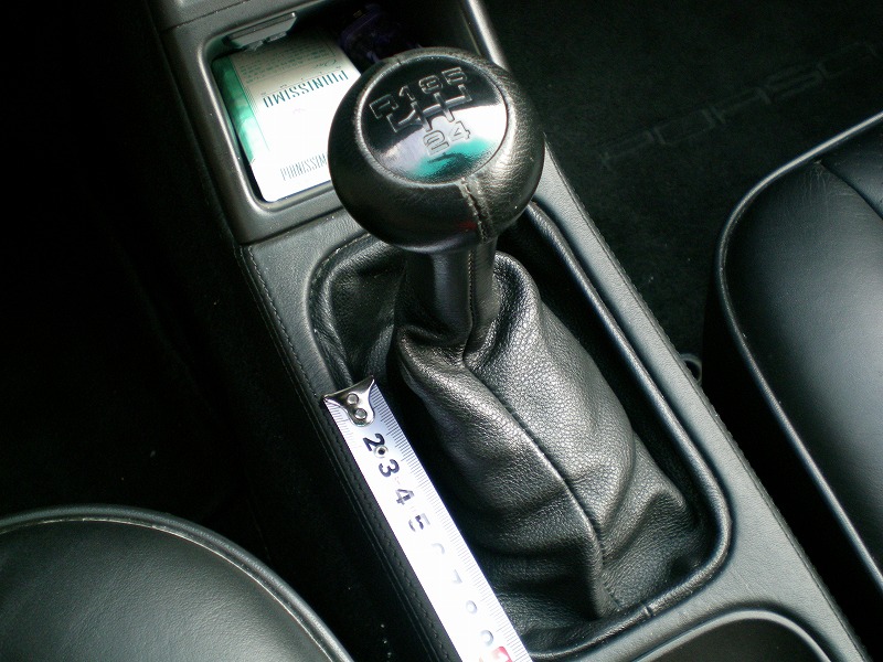 こちらの写真が2速に入れた状態。真上から見てシフトの中心からの距離で計りましたが、長さは約10cmです。これが長いか短いかは個人の感覚によって違うんでしょうが、私はぴんぽる以外の車はあまり乗った事ないのでよくわかりません。とりあえず、昔乗ってた日産・フェアレディZ(S30)日産・スカイラインGT-R(R34)よりは長いと思います。まぁシフトストロークも速く走るためには重要なんでしょうが、この時代のポルシェは早いシフトチェンジよりも丁寧なシフトチェンジが大事かもしれません。なぜならこの時代のポルシェはミッションを保護するために間違ったシフト及びクラッチ操作のダメージはすべてクラッチが受けるようになってるからです!よく昔のポルシェはクラッチが弱いと言いますが、その理由は無知なオーナーのシフト及びクラッチ操作のダメージが直接クラッチに行ってダメージが蓄積されて壊れるって言うパターンがほとんどみたいです。やっぱりきちんと理解して乗ってあげないとダメと言う事ですね・・・