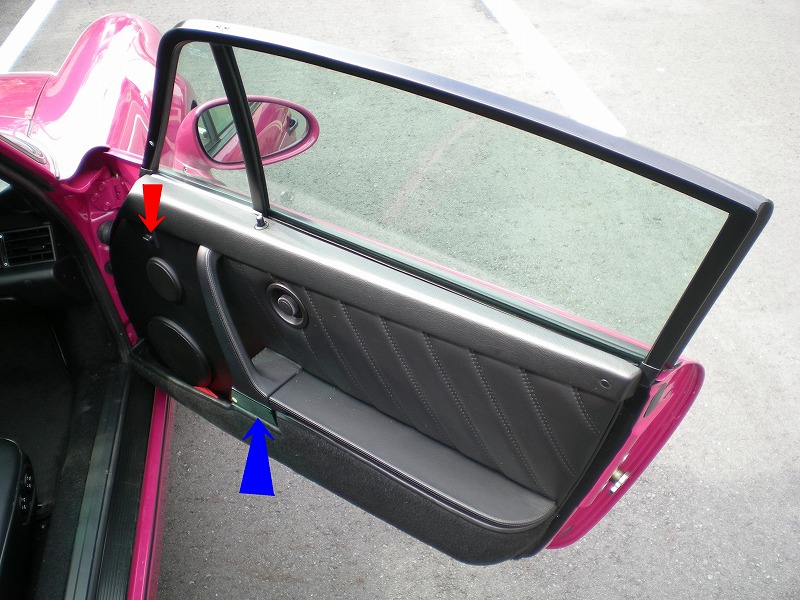 ぴんぽるは普通にドライブ等にも使っているので助手席に友達等が乗る場合もあります。まぁみなさん口を揃えて「うるさい!」、「乗り心地が悪い!」とか似たような事を言うんですけれども誰でも絶対に言う事があります。それは「ドアの開け方がわからない。」です。このセリフは初めてぴんぽるに乗った人のほぼ100%が言います。青い矢印の部分を引っ張るとドアが開くんですが確かに周りと同じ色ですしわかりにくいと言えばわかりにくいでしょうか?ちなみにその次に言われるのは「パワーウインドウのスイッチがわからない。」でしょうか?これも言われる確率は非常に高いです。乗った方の90%くらいの方が言いますね。ちなみにパワーウインドウのスイッチは赤い矢印なんですがこうして見るとわかりやすそうじゃないですか?しかし実はこれはドアを開けてる状態なのでわかりやすそうに見えるだけなんです。ドアを閉めてしまうとエアコンの吹き出し口の部分に隠れてしまってかなり見つけ難い状態になってしまいます。今後もしポルシェ・911(964)に乗る機会のある方は注意して下さいね!