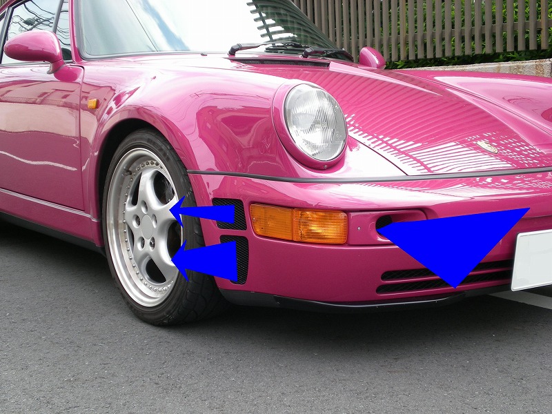 ぴんぽるは本来ならフォグランプがついてるところにダクトが空いてます。と言うかポルシェ・911(964)はほとんどがダクトになっている固体が多いです。ちなみにぴんぽるのこのダクトはダミーですので別にここから入った空気でどこかを冷やすとかそう言った効果はありません。せっかくですので下図のようにフロントのオイルクーラーを冷やせないか考えてみました。