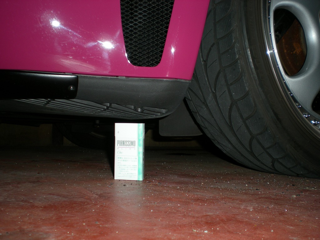 ちなみにこちらは比較用のフロントの画像です。正直な話エンジンの高さとそこまで大差ないように見えます。もちろんフロントオーバーハングとリアオーバーハングは違うので同じような高さだったからと言ってあんまり関係ないんですがね。ちなみに昔に比べてかなり車高は上げたのでこの高さになってからはスタンドやコンビニに入る時に擦ると言う事は1回もないです。