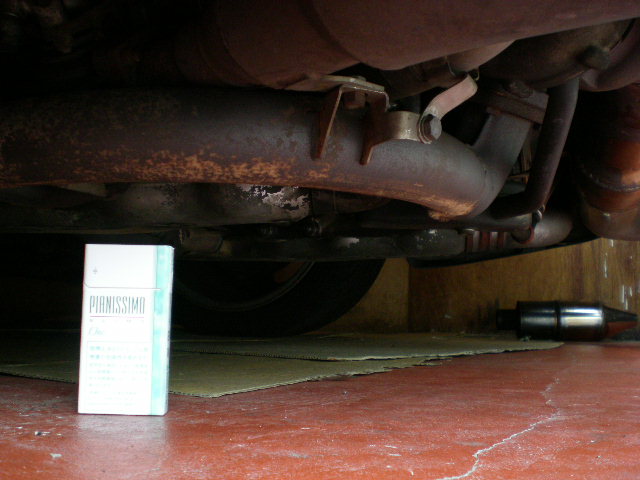 とある漫画を読んでいたらその中で「ポルシェのエンジンをリアバンパーから覗けばみんなおどろくのヨ、エンジンが後ろにぶらさがってる、なんて低いトコにあるんだって・・・」、「ドライサンプのメリットはオイルの管理とエンジン高の低さ、とくにポルシェはエンジンの低さとそのマウント位置に異常に執着してる。」とのセリフがありました。それでは実際に実物を見てみようと言う事でエンジンの真下の写真です。見事なまでにエンジンが釣り下がってるのがわかります。以前の写真と同じようにタバコの箱を置いてみたんですがタバコの箱くらいの高さしかないです・・・確かにこれは低いです!比較対照にタバコ置いてみたの初めてですがここまで低いとは思いませんでした。確かに異常に低いですね!