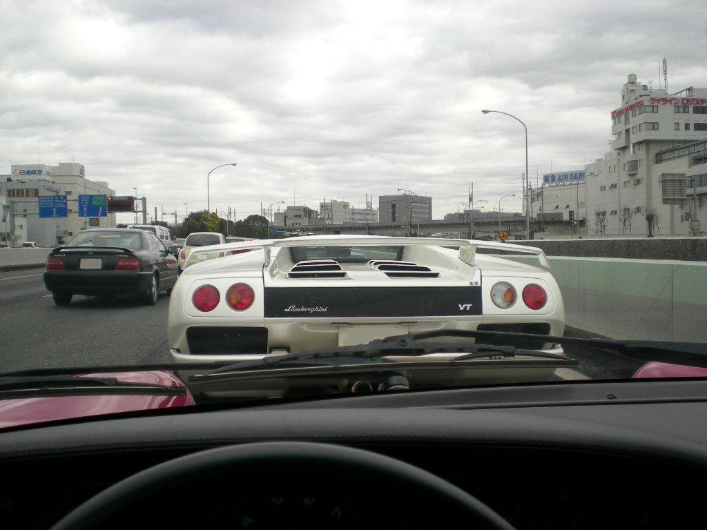 ぴんぽるの車内から見たディアブロです。ちょっとわかりにくいのですが、この白いディアブロの前にいるのもディアブロなのでやたら遠くまで見渡せます!前に車が止まってるのにここまで前方視界がいいのは初めてでした。車高がとことん低いスーパーカーは後ろの車の視界に対して優しいと言う事を知りました!!