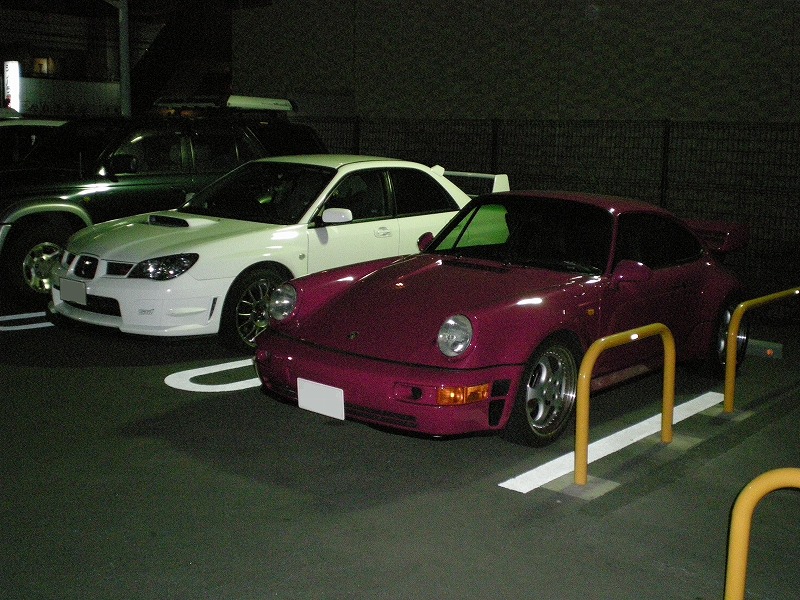 インプレッサとのツーショットです。今のインプレッサはハッチバックになったのでこれがセダン系では最終型のインプレッサと言う事になるんでしょうか?個人的にインプレッサは大好きな車の一つなんですが、新型のハッチバックはちょっとデザイン的に微妙な感じです。新型は乗った事ないので走行性能についてはわかりませんが、デザイン的にはやっぱり私はGC型が一番好きです。22B等伝説の多いモデルからなのかわかりませんが、今だに高価格です。ちなみにこの写真のGD系モデルは出たばっかりくらいの時に1回試乗した事がありますがかなり私のイメージとは離れた感じがありました。GC系は友達に乗せてもらった事があるんですが、GC系はぴんぽると同じくらいのどっかんターボでした!4000回転くらいを境に本当に脳みそ置き去りにされるくらいの加速を見せてくれたGC系に比べるとGD系はすごくマイルドだった感じがあります。もちろん安定感もありますし、総合的には速いんですが刺激が若干おさえられた感じがありました。ちなみにボディはものすごくしっかりしててドアの開け閉めしただけで、剛性感をものすごく感じとれました!新型はさらにボディ剛性をも上がっているでしょうし速さでは最速なんでしょうね!デザインはともかく世界最速2リットルエンジン車の片翼としてどんどん進化していって欲しいと思います。