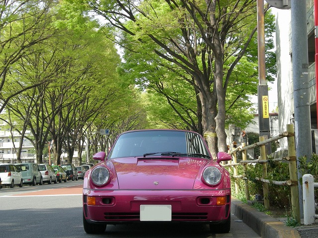都内のある並木通りでの写真です。そろそろ暖かくなってきて緑が目立つようになって来ました。しかしぴんぽるはこうやって緑と言う色とならべると異様に映えると言うか目立つと言うか、とても対極にある色だと言う事がわかります・・・自然界でこんな色してる動植物はめったにないし、あったとしても南米とかにいる毒カエルくらいでしょうか?ぴんぽる自体カエルに似てるからある意味正解かもしれませんね。ちなみにぴんぽるの年式のポルシェは本当に毒カエルみたいな色のモデルが多数あります。ミントグリーンやマリタイムブルーなどかなり似てると思います。でもどれもなぜかとてもキレイで似合ってるのがある意味さすがポルシェと言うところでしょうか?