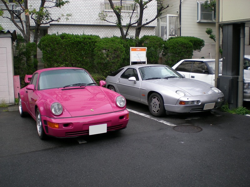 とある駐車場でのポルシェ・928とのツーショットです。こうして見ると車高といい、空気抵抗といい非常に計算されたデザインと言う感じがします。しかも4.5~5.5リットルエンジンで馬力が300~320ps、トルクは50kgm以上(モデルによって異なります。)と、トルクなどはぴんぽるより出てるし実は同年代の911ターボより速いんじゃないかと思うような車です!確かに世間で言われているようにあまり商業的には成功したとは言えないモデルかもしれませんが、928は非常に好きな車の一つです。たまに走ってるのを見ると嬉しくなりますね。この928もとてもキレイでオーナーさんの愛情を感じられる車でした。最近は個性的な車が減ってきてるので、大事にされている味の濃い車を見ると何か嬉しい気持ちになります。
